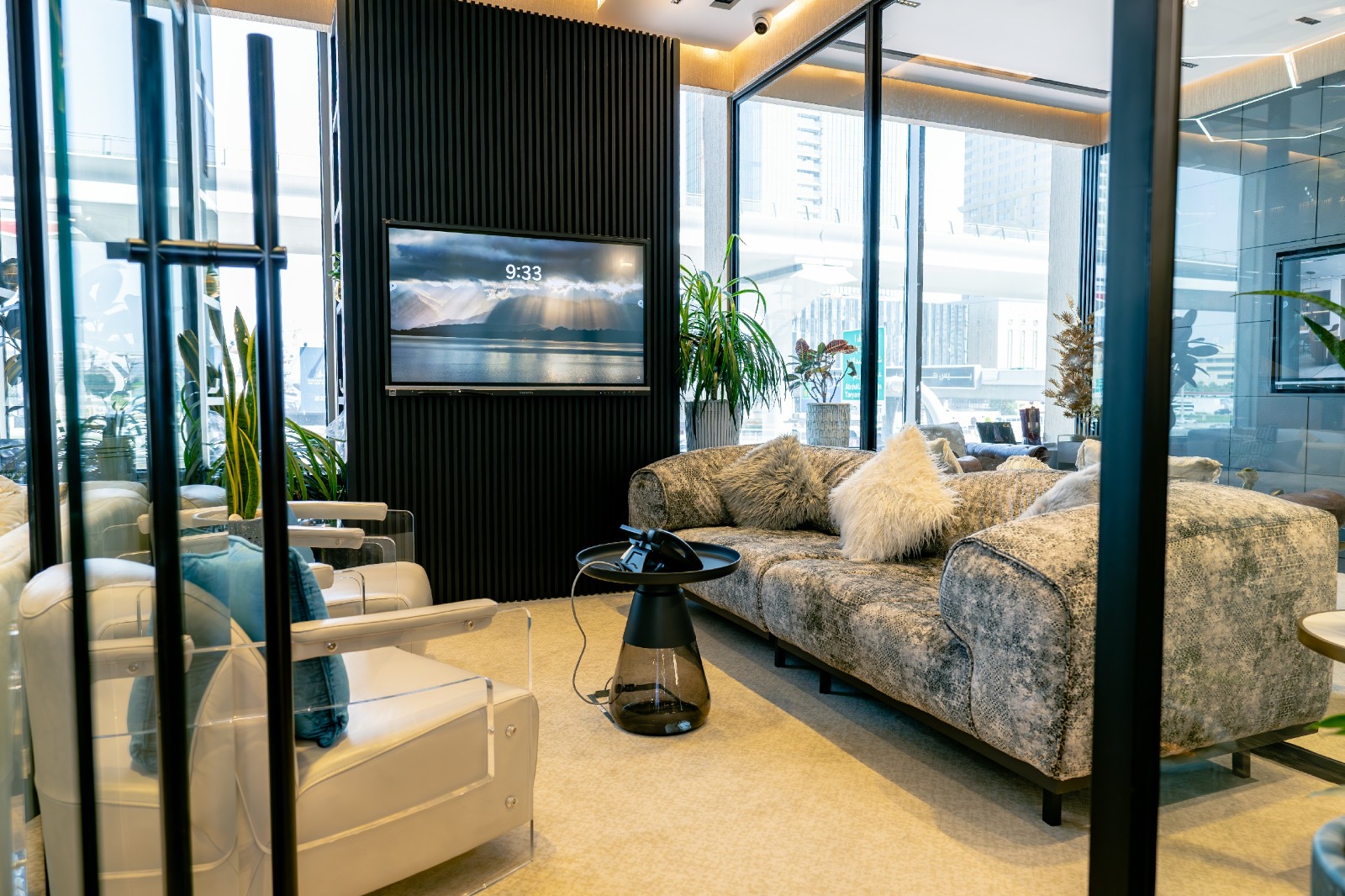 Frameless tempered glass partitions enclose lounge areas featuring plush seating in bouclé, chenille, and velvet upholstery. Custom armchairs combine acrylic frames and kiln-dried hardwood cores, blending comfort with elegance.
